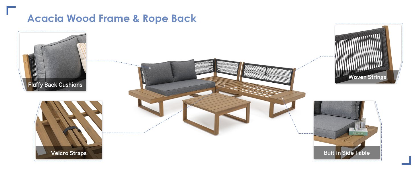 - COMFORT UPGRADE -With clean, precise lines, our modular sectional sofa is the ideal modern accessory for your outdoor space. Wooden frame with woven string backrest, this wood outdoor furniture not only offers a chic appearance but also provides stable structure.