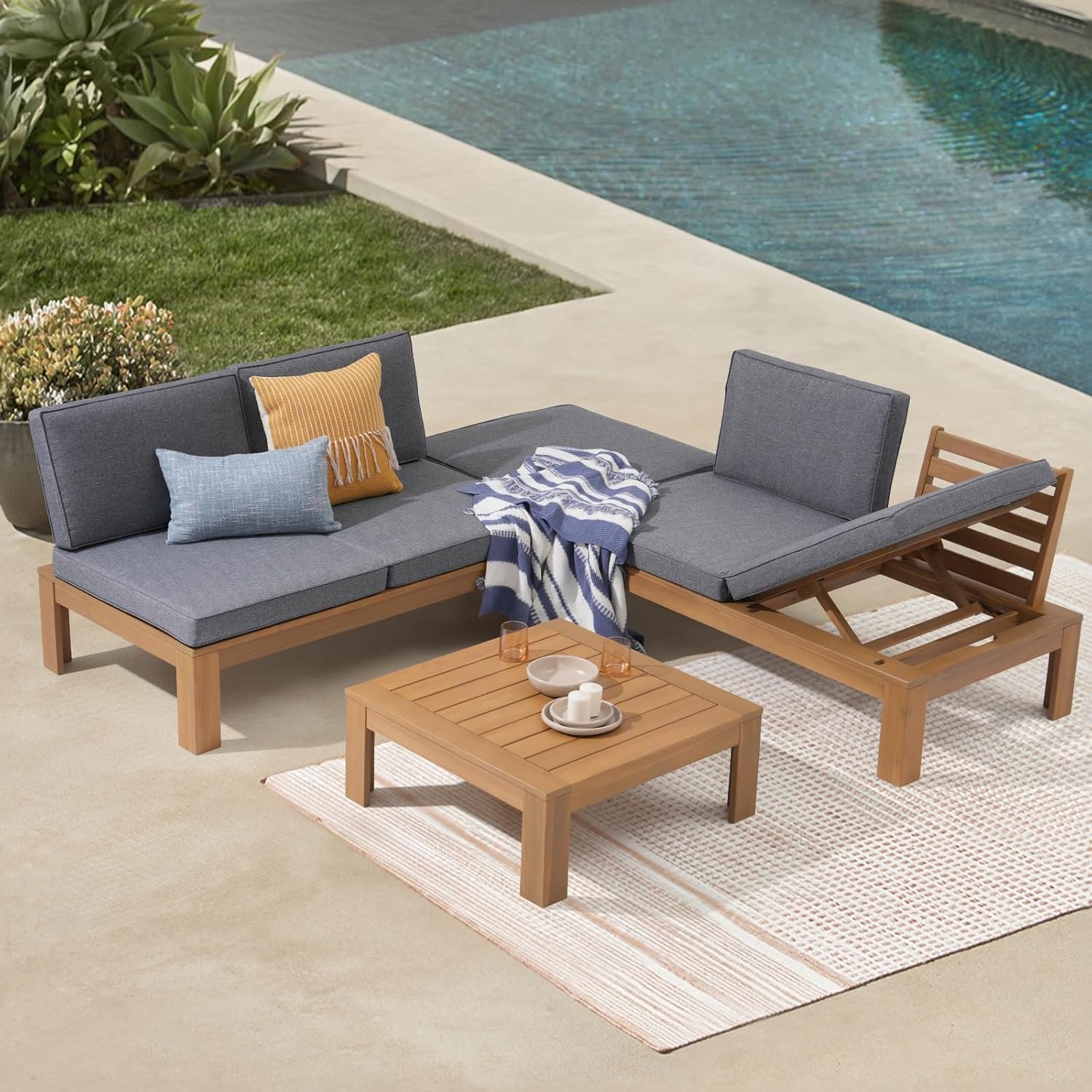 - ACACIA WOOD: Made with acacia wood that brings a sleek and exotic look to your space, this durable modern outdoor set naturally withstands outdoor elements and will not darken over time. Acacia wood is perfect as a solid, heavy frame that resists wear and tear.