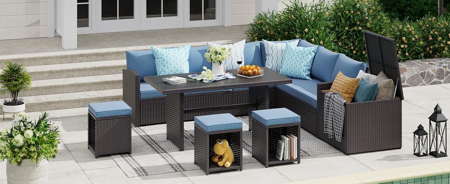 - Durable & Beautiful The layout of 7-pc. outdoor sectional sofa sets are suitable for any outdoor space. Fashionable rattan and modern design may attract everyone’s attention and the sturdy construction will make this piece a favorite of yours. Come to create a wonderful and luxurious outdoor living space for you and your significant others.