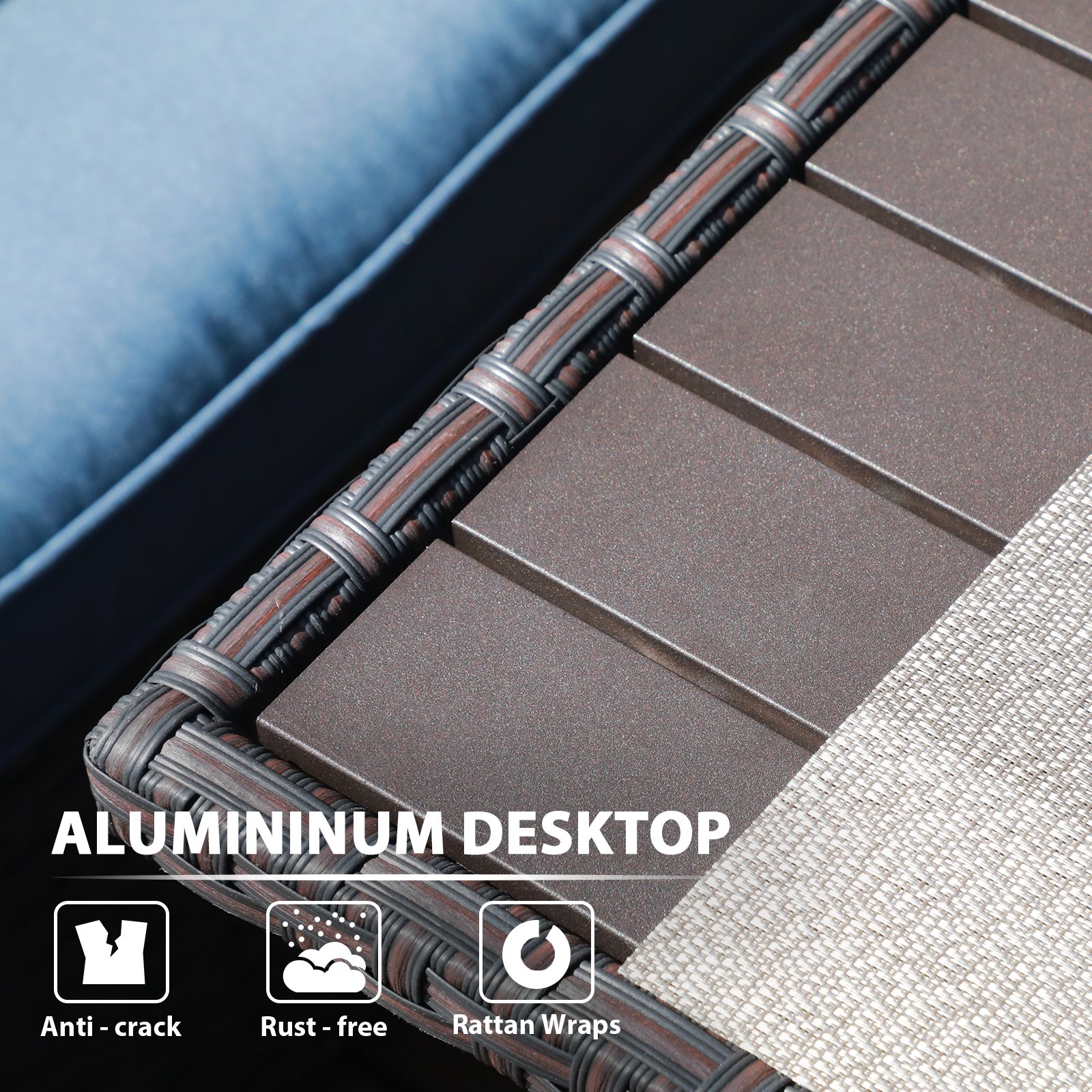 - User-Friendly Details The tabletop is made of aluminum, which makes the table lighter in weight for easy moving, yet keeping the function sturdy and crack-anti as well as rust-free. Also, the rattan wraps all sides of the tabletop for upgraded safety. Plus, the inner part of the patio ottomans provides extra storage space for toys or books