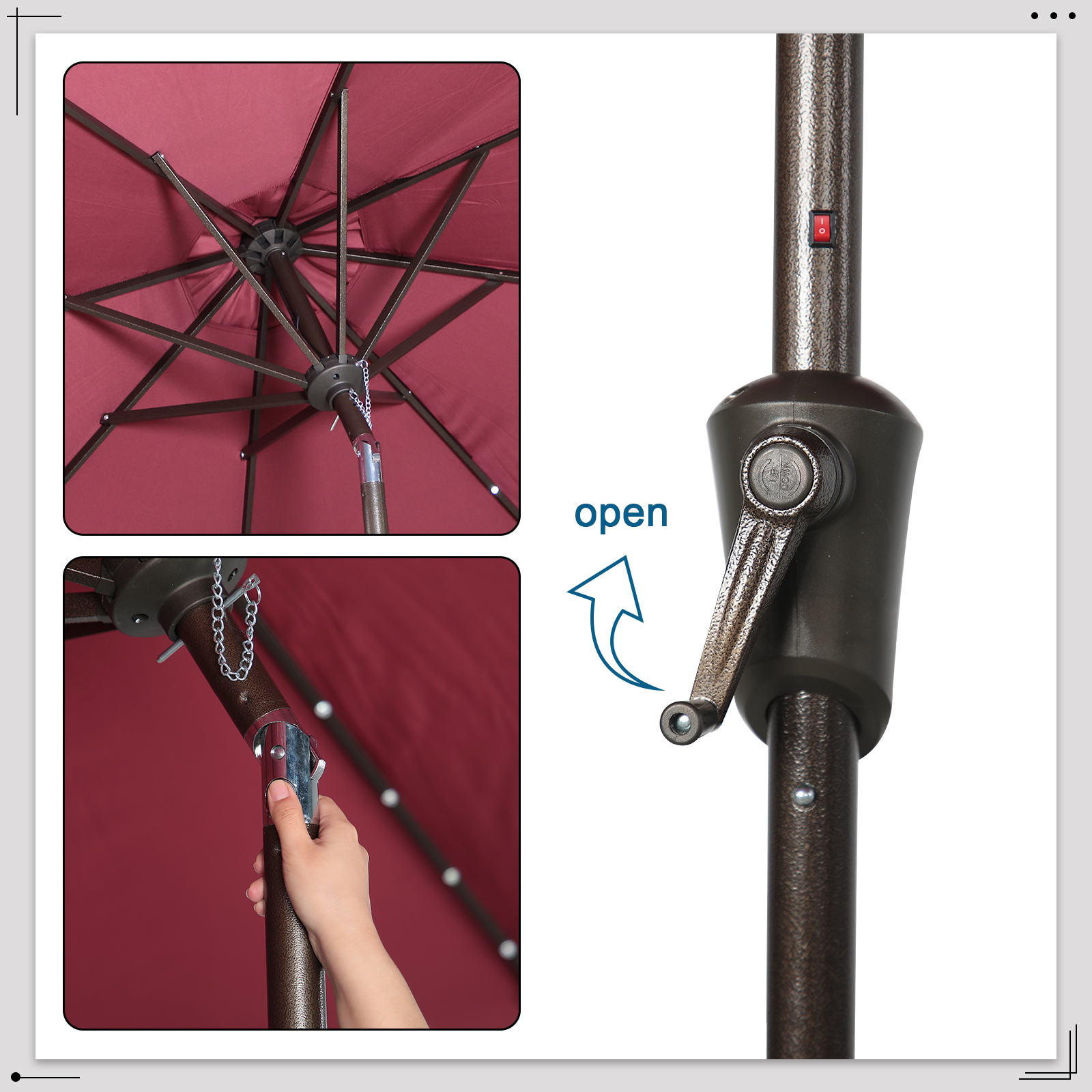 - Convenient Tilt & Crank Systemļ¼ Our patio umbrella is easy to open and close by the crank handle. The tilt function adjusts up to 45 degrees, pressing the push button can adjust it according to the sun position, while a wind vent cools air under the umbrella.