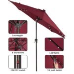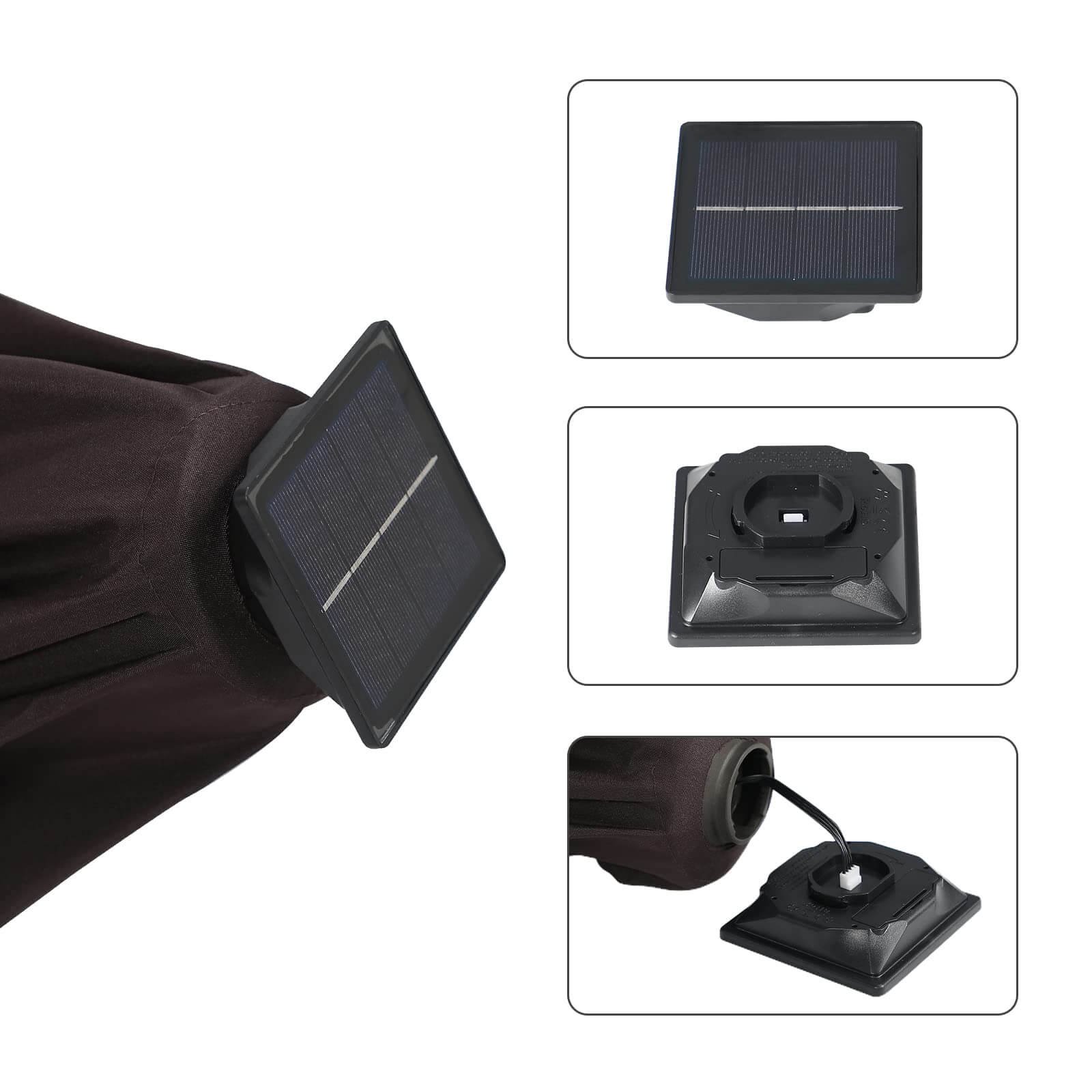 - Solar Powered Umbrellaļ¼ Crafted with 32 built-in LED lights, 4 LED lights on each rib, 8 ribs construction. There’s also an on/off switch for LED lights, which can be closed during the day and opened to light up a relaxing night and create a warm atmosphere.