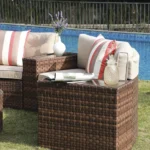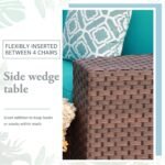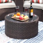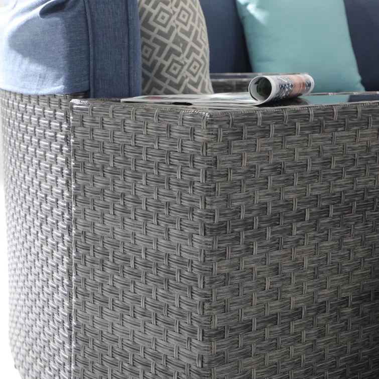 - ćFour Side Tablesć – The sophisticated wicker design side table is hand woven by resin wicker and powder coated steel framed for seasonal outdoor use. It is a great addition to the curved outdoor sectional to keep books, drinks, foods and small plates within reach. The tempered glass table top requires low maintenance.