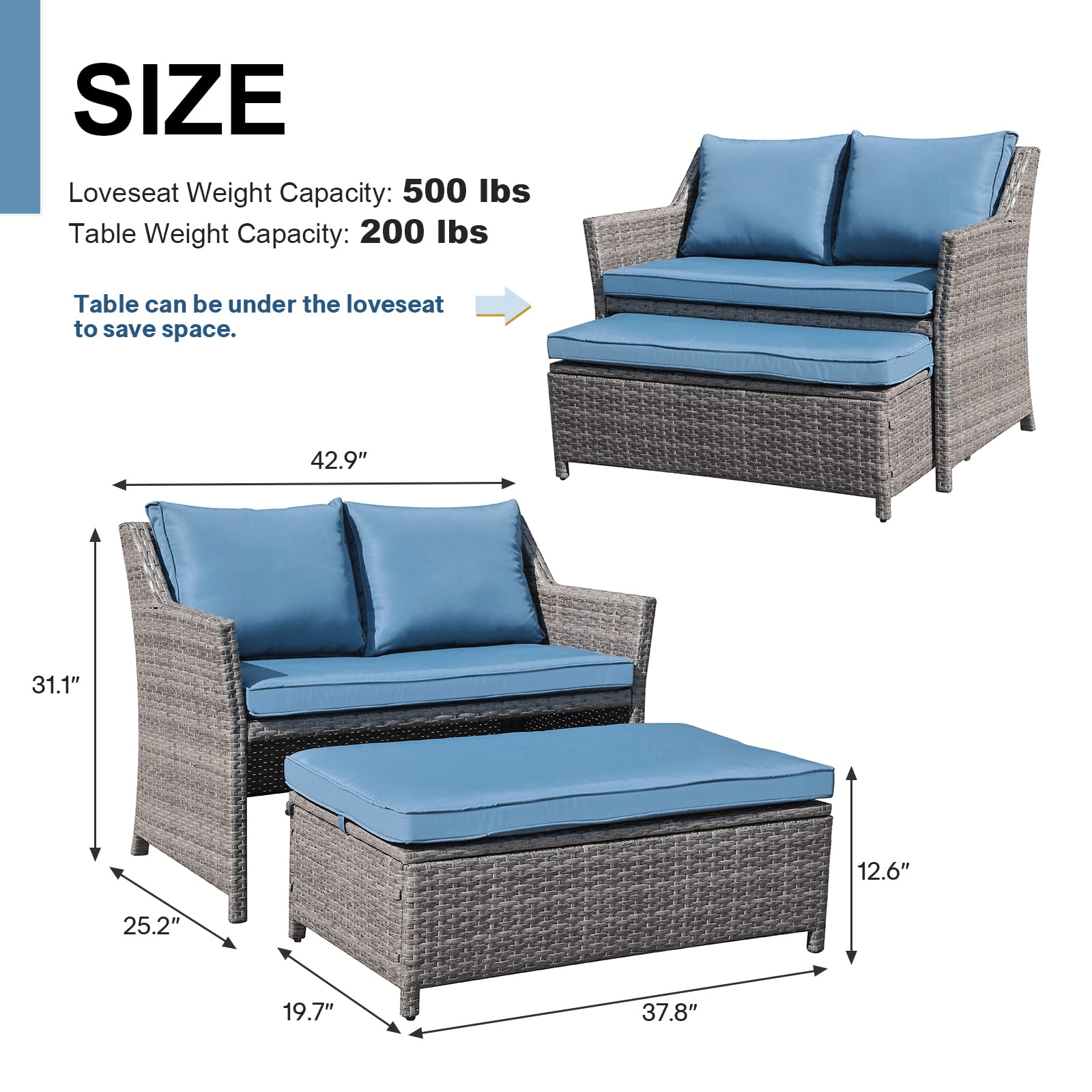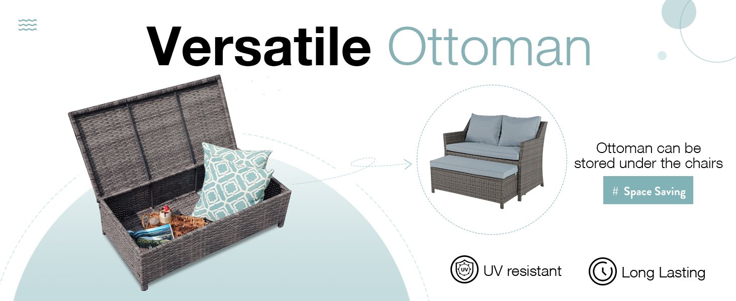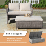 - Convenient Storage–Unique storage bin built into the coffee table give you room to store extra pillows or personal items. The coffee table can be not only used as ottoman but also stored under the loveseat to save space.
