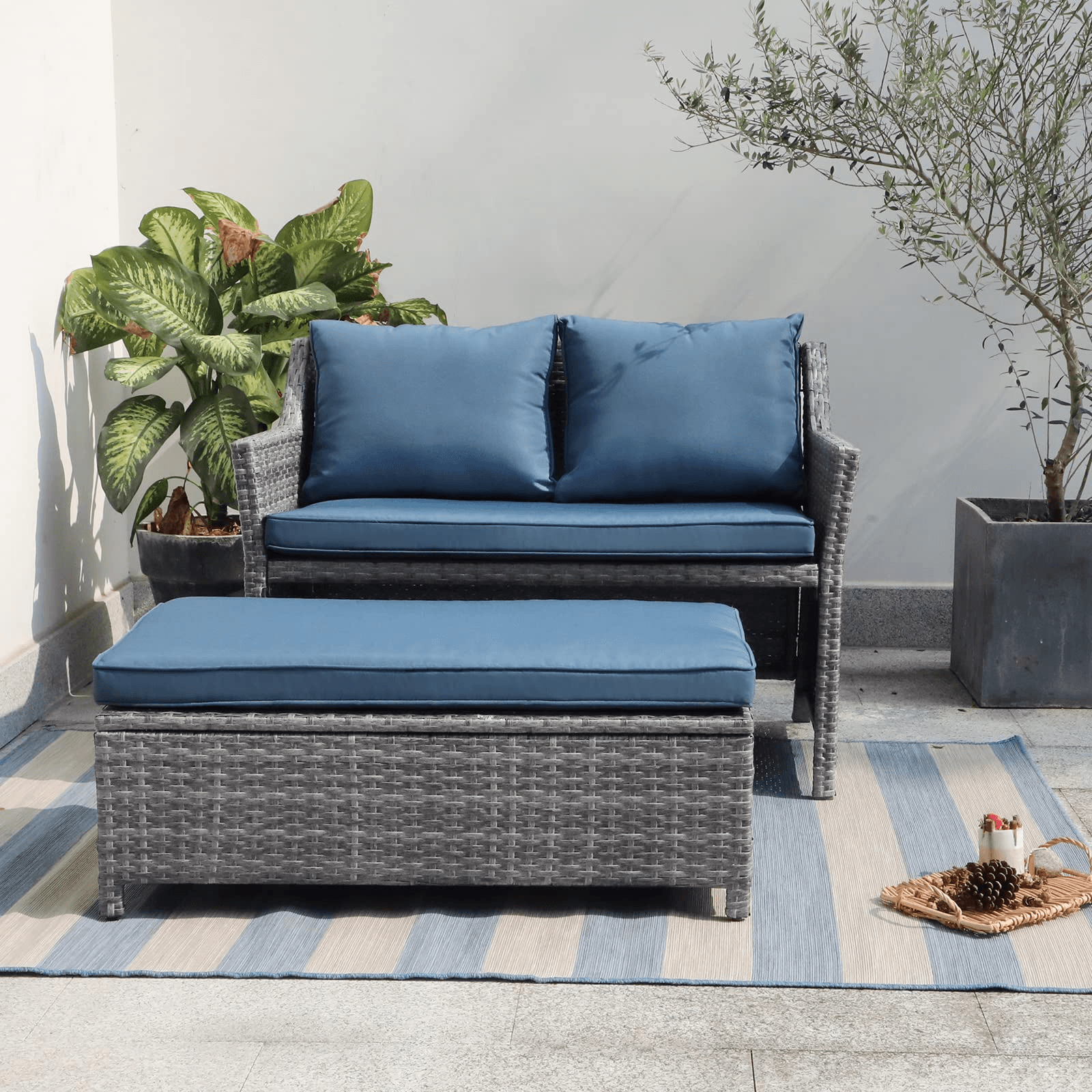 - Perfect for Any Scene–With grey wicker and Aegean Blue/Beige/Grey cushions with a natural look, the accent set is a perfect addition to a small balcony, deck, backyard, porch, poolside and any other indoor & outdoor décor.
