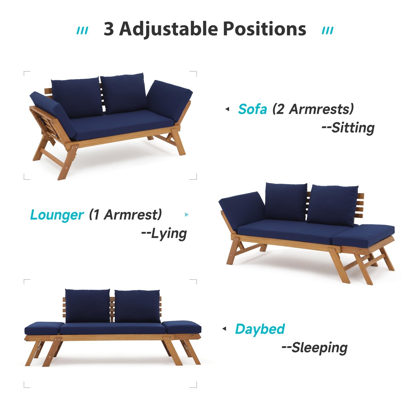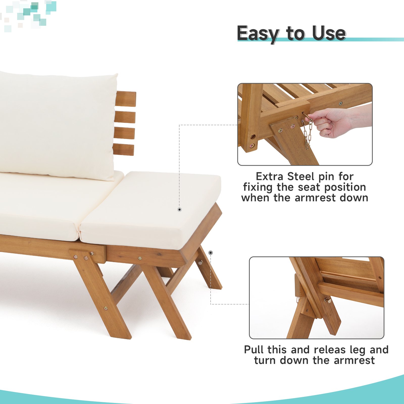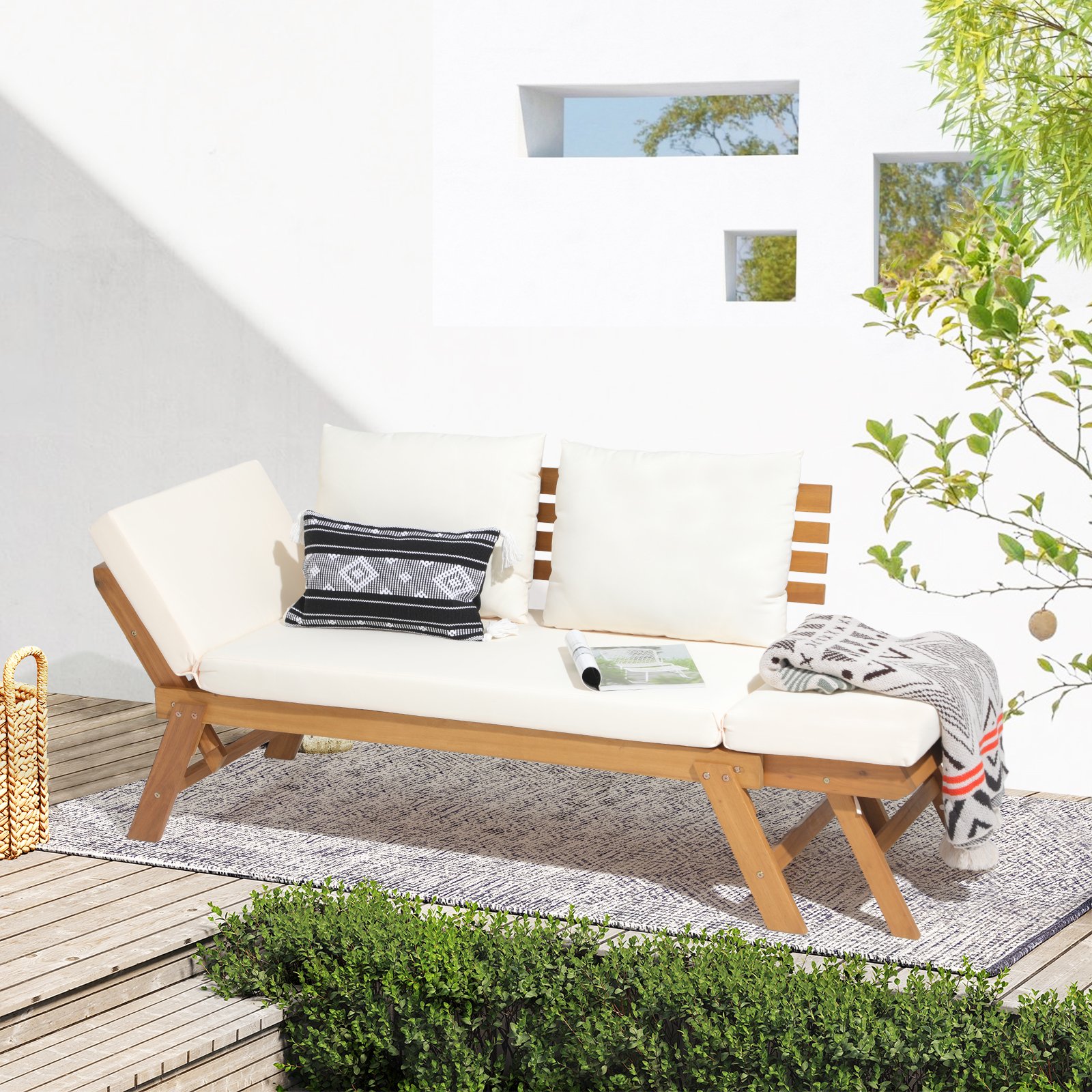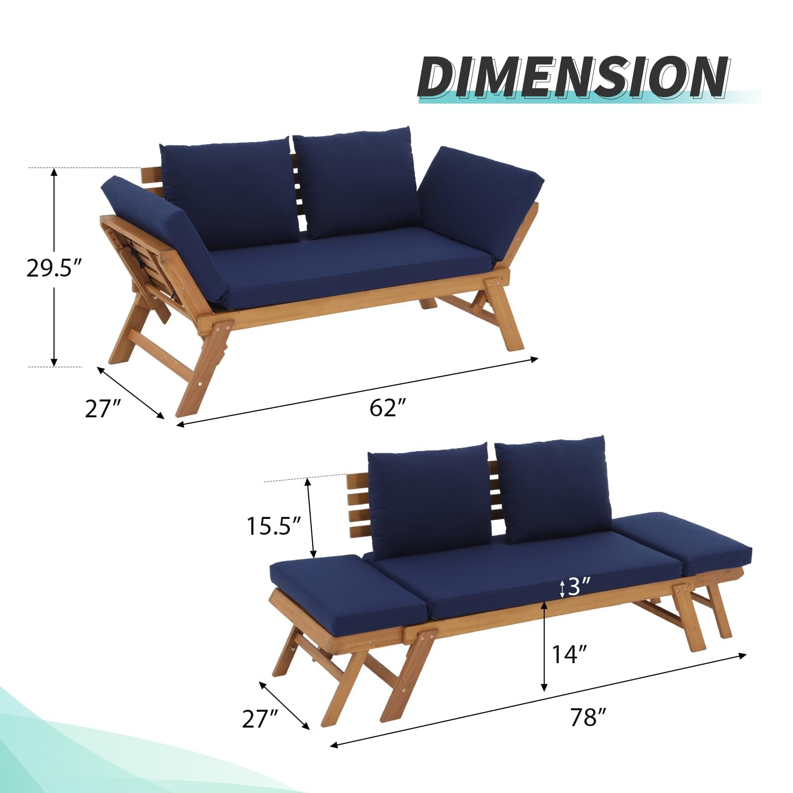 Outdoor Convertible Sofa Daybed, FSC Acacia Wood Patio Couch with Thick Cushion & Pillows